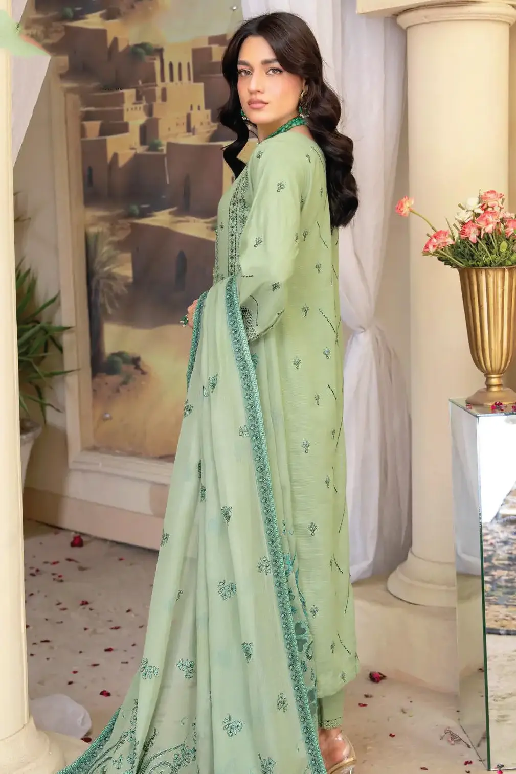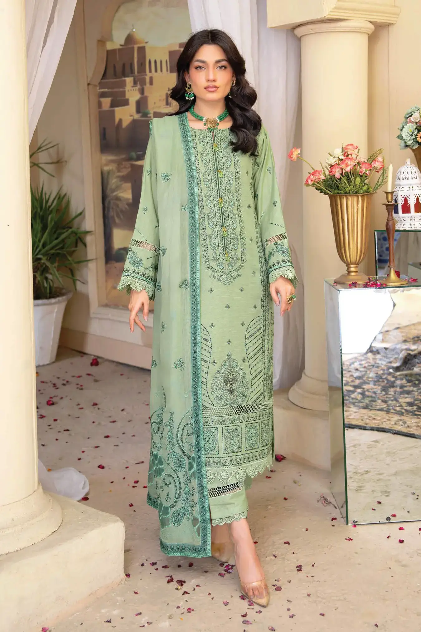 Adding a graceful touch, the luxury crinkle dupatta is adorned with finely embroidered appliqué lace work. Its lightweight texture flows beautifully, giving the outfit a sophisticated finish. The dupatta not only complements the shirt but also enhances the overall appeal with its intricate embroidery, making the ensemble stand out at any occasion.