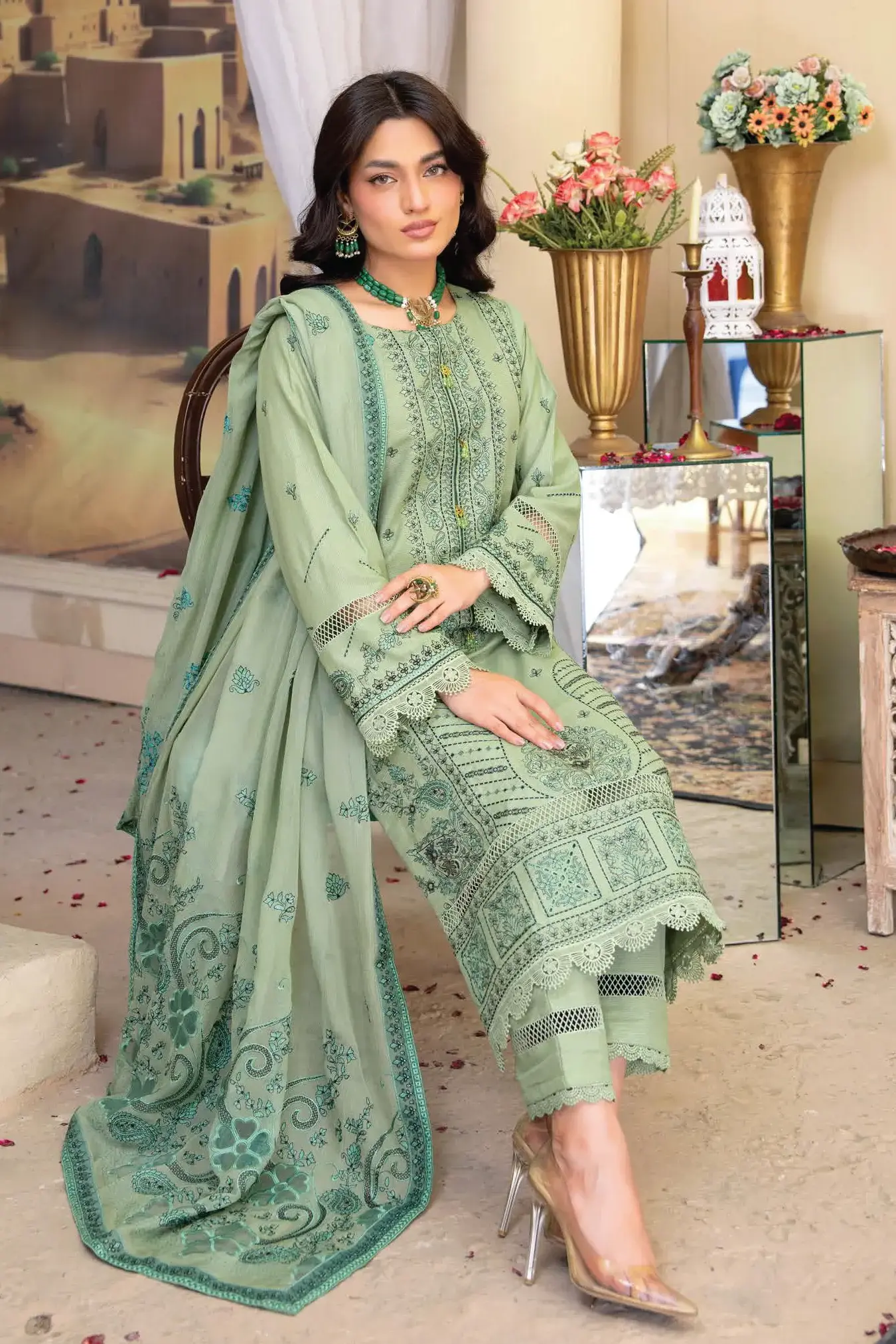 Every detail of MaheNoor By Aalaya speaks of luxury and grace. The embroidered Karandi shirt highlights fine craftsmanship, while the crinkle dupatta with appliqué lace enhances femininity and charm. Paired with a comfortable trouser, this ensemble delivers a complete look that is stylish, comfortable, and culturally rooted.