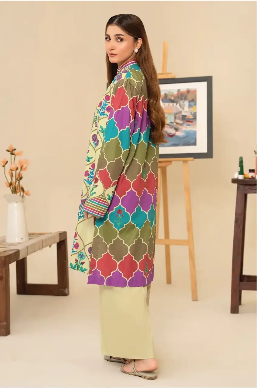 Nayab By Safa Noor is known for its carefully chosen fabrics that blend comfort with style. The front is designed with Widder Intermix Cotton Print, offering a unique visual appeal. The back features Widder Cotton Print, balancing modernity with tradition. Completing the set, the trouser comes in Widder Intermix Cotton Dyed fabric, a perfect choice for versatile styling.